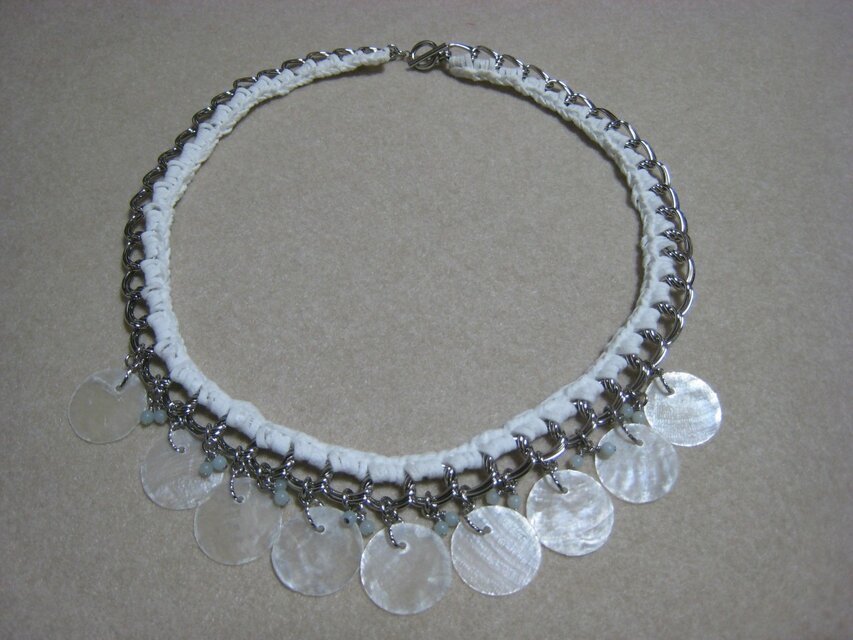 チェーンにフェイクスエードテープを編み付け、WHITEシェル(直径約20mm)とアマゾナイト3mmを下げたネックレスです。