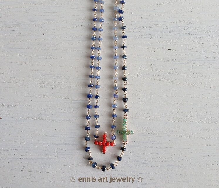 極小ボタンカットのサファイアをグラデーションカラーでめがね留めしたロングネックレスです。