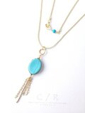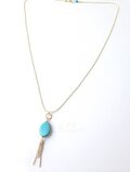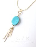 存在感のあるデザインが魅力的なターコイズを使用したロングネックレス。ゴールドのボールチェーンも華やかさをプラスしてくれます。Tシャツ一枚にさらりと身に着けるだけで夏コーデに大変身。バックにもブルーターコイズを一粒あしらいました。ターコイズのチャームがみぞおち下にくる長さです。縦長VラインでスタイルUP効果あり☆