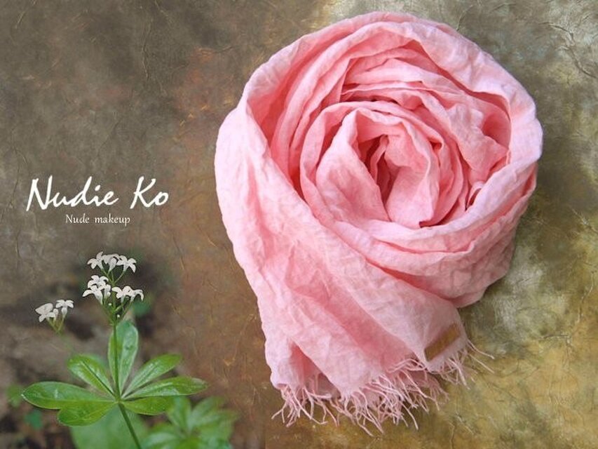 この作品は車葉草(くるまばそう)というアカネ科の植物の根で染め上げてミョウバンで媒染しピンク色に染め上げました。