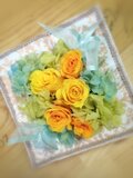 優しいブルーをプラスして仕上げたプリザーブドフラワーアレンジ!
