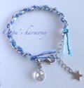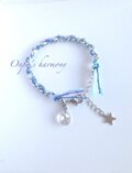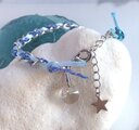 ブルーのサテンコードと異素材のグラデーションブルーの糸をチェーンに編み込みました。