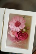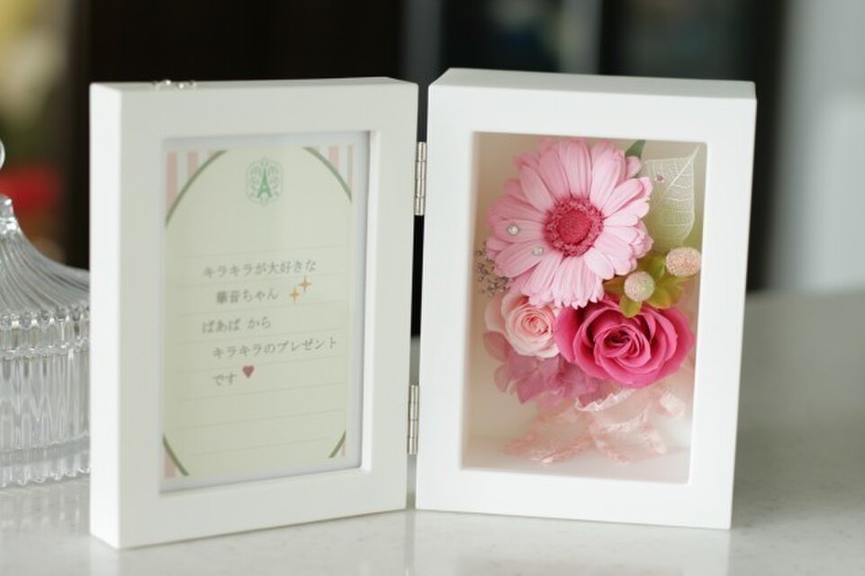 お誕生のお祝いにとオーダーいただいたフォトフレームのアレンジ。