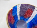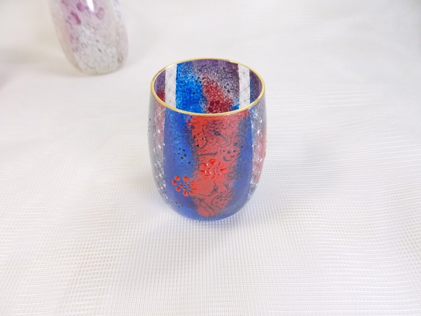 小さなグラスに手描きました。花火の色をイメージしフルーツを描き、もりもりもこもこ描きました。隙間をレース風に仕上げました。手で持った時の凹凸が印象的です。