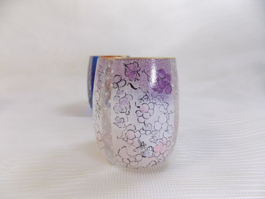 小さなグラスに手描きました。花火の色をイメージしフルーツを描き、もりもりもこもこ描きました。隙間をレース風に仕上げました。手で持った時の凹凸が印象的です。