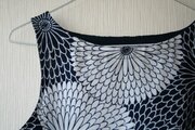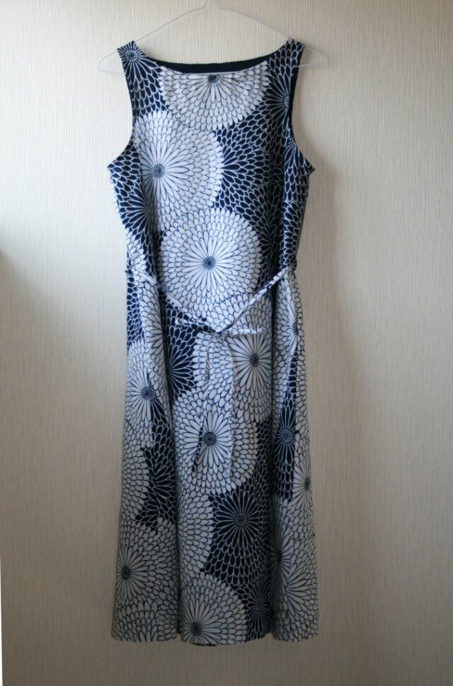 紺色の升目と白地がリラックスした雰囲気を醸し出す浴衣生地でノースリーブワンピースを作りました。裾回りを多くとっているので、体から自然に空間ができ、楽ちんな着心地です。浴衣姿ももちろん素敵ですが、ワンピースは和風の印象を残しながらも、気軽に着ていただけて、蒸し暑い日にはうってつけと思います。