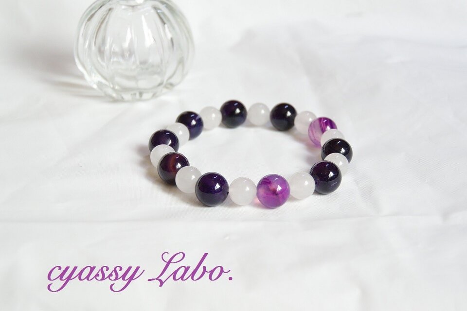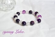 まるで濃いグレープのキャンディのような紫アゲートと、涼しげで美しい白翡翠を使った、シックでシンプルなおまもりブレスレットです☆(金属未使用)