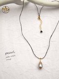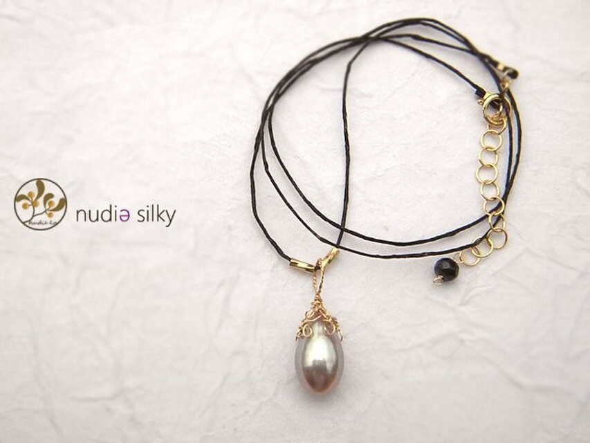 黒いシルク糸と、妖艶な色合いの淡水パールが少しダークな印象の、繊細で個性的な