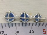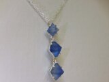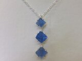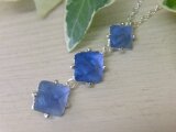 涼しげなメキシコ産ブルーフローライト八面体の3連シルバーペンダント、サイズのグラデーションです*裏面への差し込みや接着では透明度の高い石ほど加工痕が見えてしまいますので結晶に合わせた専用の石枠を作っております*このフローライトは白熱灯光で紫色にカラーチェンジします*八面体のうえ3連なので複雑な動きを見せます*ひとつとして同じ物が無い原石による1点モノをお楽しみ下さい*黒化遅延の樹脂コートを施してあります(チェーン長さ40㎝:長さのご要望がございましたら承ります)