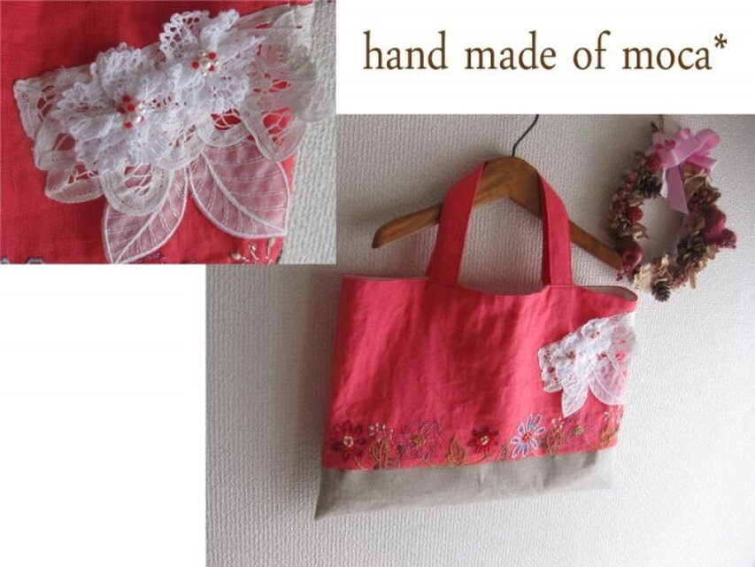 バテンデザイン刺繍リネンバッグ/トート★コーラル