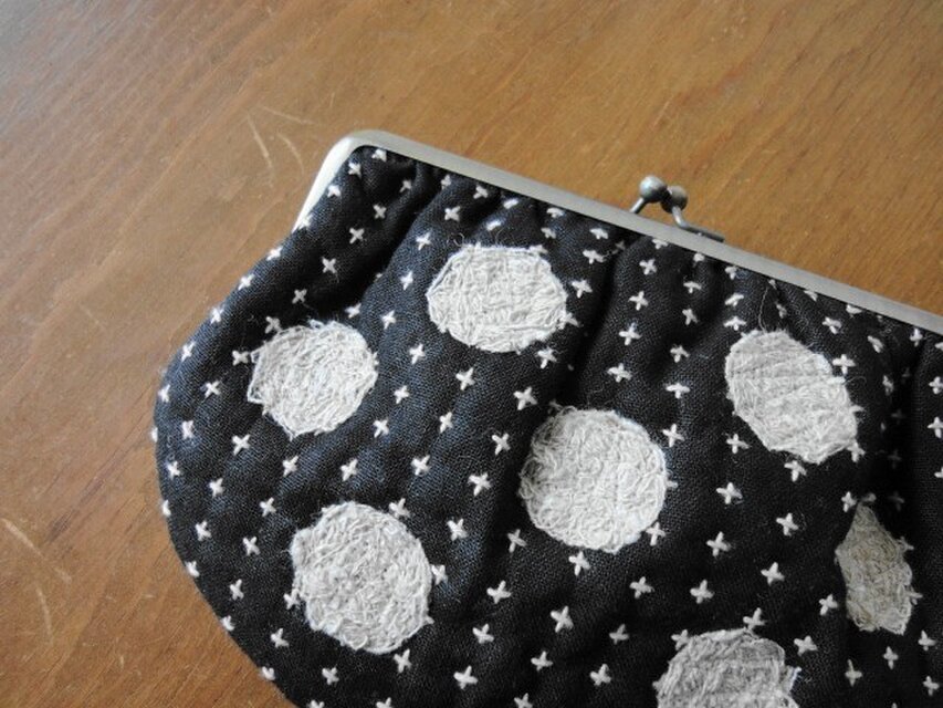 刺し子のドットがま口 < 黒地×ベージュステッチ×麻色ドット >