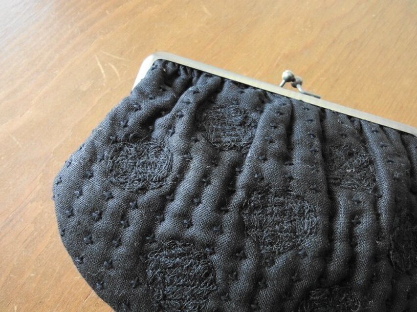 [ 再販 ] 刺し子のドットがま口 < 黒地×黒ステッチ×黒色ドット >