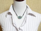 チョーカーの長さは約39~75cmです。結び目を動かして長さを自由に調節できます。こげ茶色のロービングヤーン綿100%の紐を使用しております。