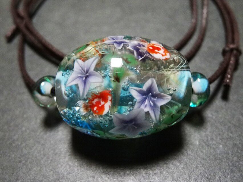 金魚と桔梗は表面に描いたのではなく、ひとつずつパーツを作り、溶かしたガラスに埋め込みながら制作しております。