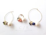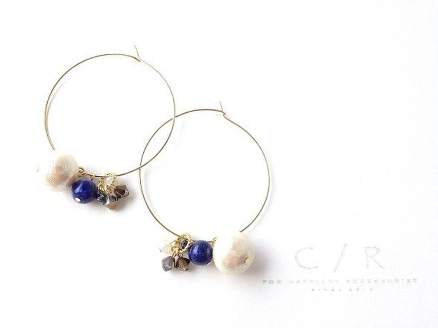 華奢なゴールドフープに、コットンパール、ネイビーカラーのラズライト、スワロフスキーの3つのチャームをその日の気分、ファッションに合わせて組み合わてお楽しみいただけるカスタマイズピアス☆