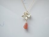 こちらは、天然石の中でも特に希少石とされるインカローズのしずく型(ロードクロサイト)を使用し、すみれのメタルチャームを組み合わせて作製致しましたネックレスチャームでございます。