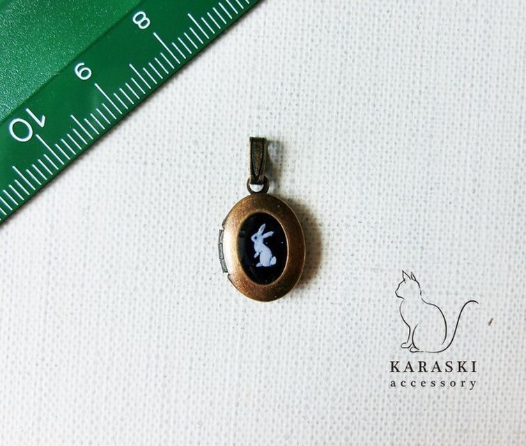 白いうさぎを描いたオリジナルイラスト(原画)をレジンでとじこめたちいさなロケットです。