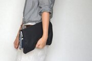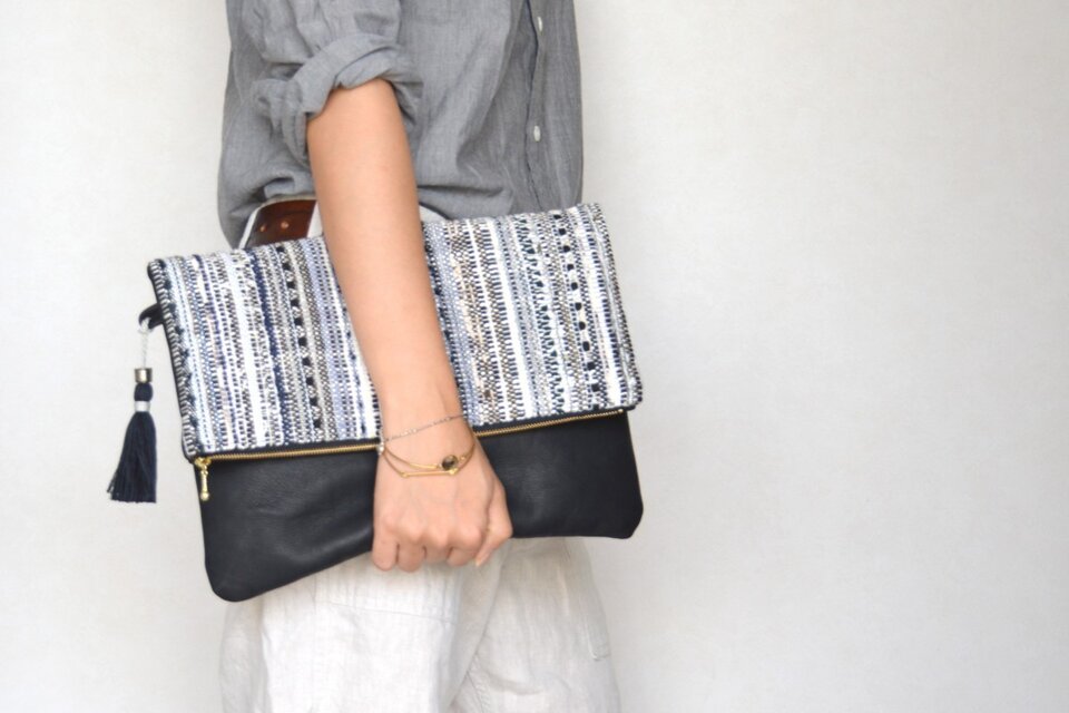 裂き織りやリボン等で織った生地と皮革を組み合わせたクラッチバッグです。
