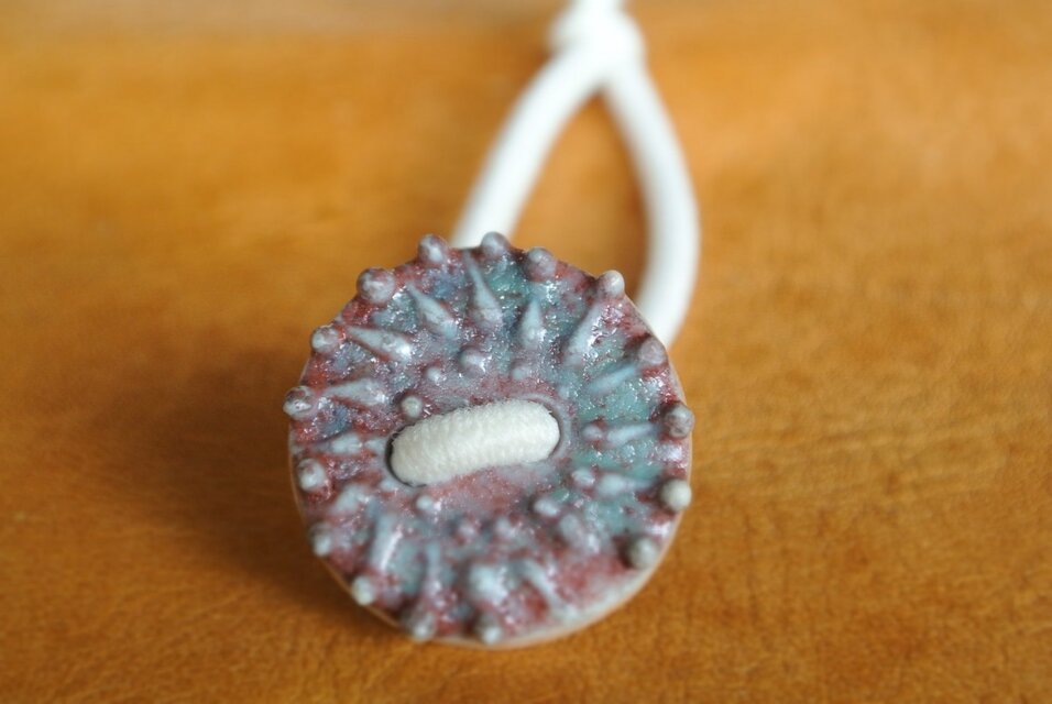 丸いボタン風の陶器にポツポツの凹凸模様があり、あかとみどり色が入っています。