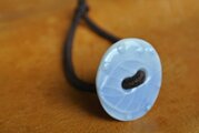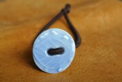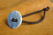 丸いボタン型の陶器に葉っぱ模様があり、淡い水色の仕上がりです。