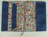 刺繍はミシン刺繍。表地は綿100%、裏地も綿100%です。しおり端の飾りは青と赤の天然石です。