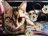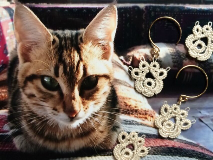 ねこの肉球を繊細なレース糸で編んで、ピアスにしました。