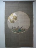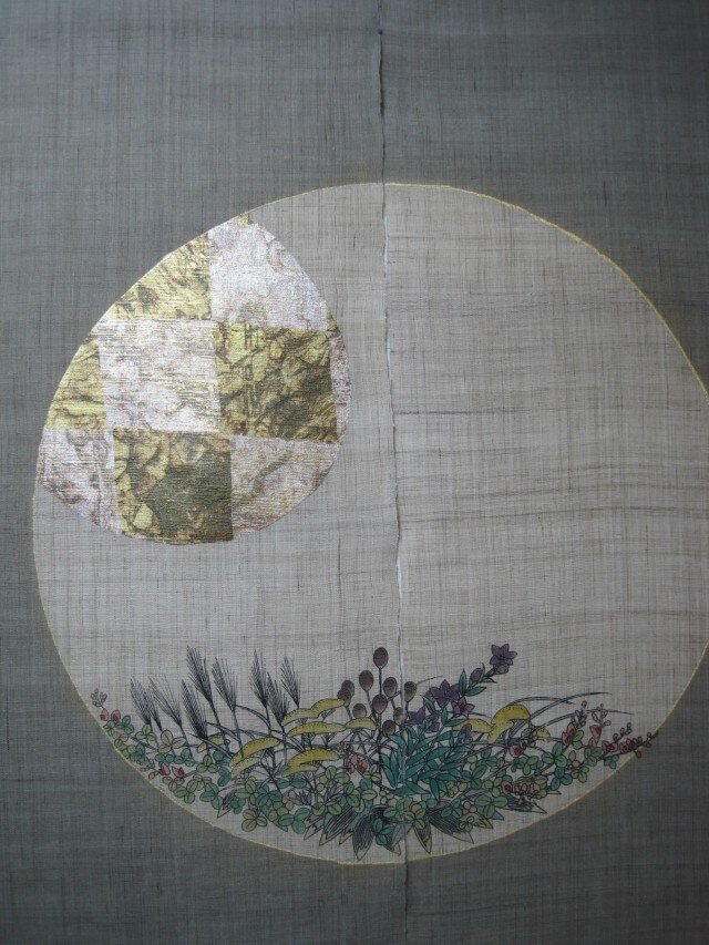 秋草の手描友禅に 大きなお月様を銀の焼き箔「硫黄で焼くと面白い変化をします」と