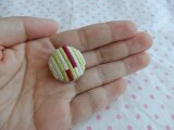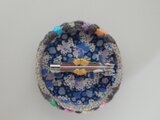 麻布にびっしりと刺繍し、くるみぼたんのブローチとして