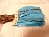 写真でも質感が伝わるかと思いますが、青色の革を縦にしわを付けたままプリーツ状にプレスして染めた牛革です。