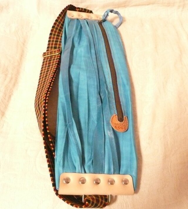 珍しいしぼりムラ染めのワイルドな感じの1枚革をで作ったボディバッグです。プリーツは規則的ではなくワイルドな感じです。