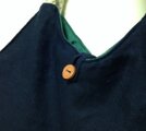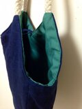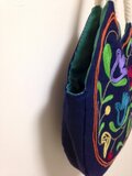 色鮮やかな花の刺繍が入った紺色バッグ。サイズは横36cm、縦27cm、マチ6cm。持ち手はしっかりしたロープで、肩にもかけられる長さです。