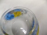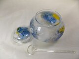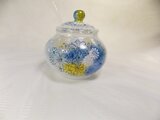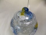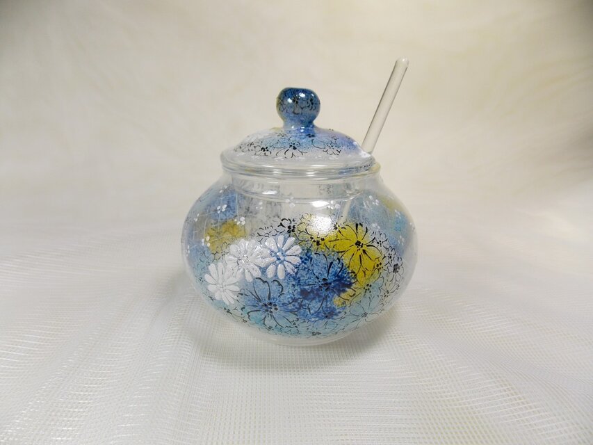 ガラスのレードル付きポットにレースとお花を描きました。全体に薄い色を入れ、部分的に青、黄色、白を。ドットとお花で凹凸をつけて、印象的にいたしました。