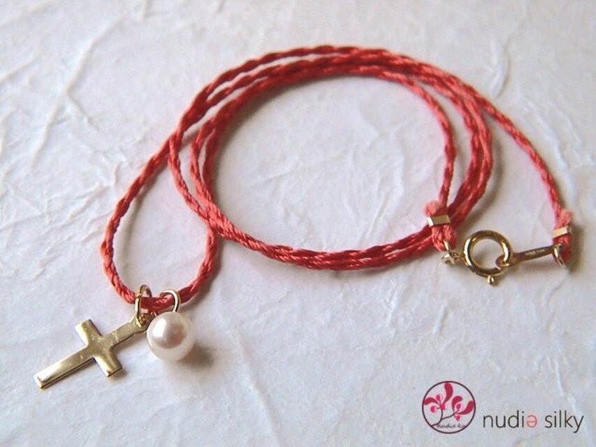 のコードに丁寧に編み上げました。シルクが艶やかで細く繊細なネックレスです。