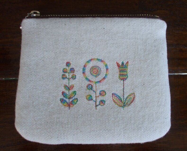 生成りの起毛キャンバス生地に段染め糸で花刺繍をしたミニポーチです。