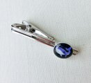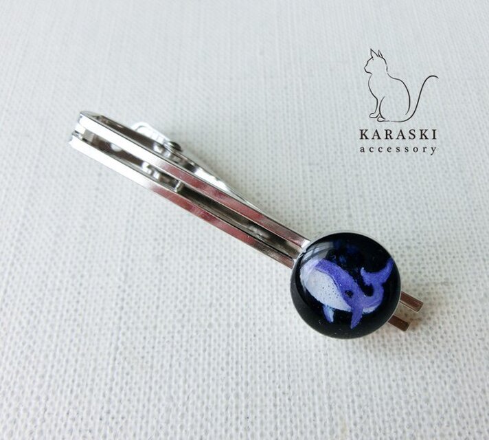 濃紺の背景にくじらを描いた絵を、樹脂で閉じ込めたネクタイピンです。