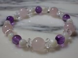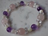 こちらはローズクォーツ(10φ )+アメジスト(7φ)+マザーオブパール(5φ)+ムーンストーン(5φ)+水晶(8φ T=4mm 多面カット)を組み合わせたパワーストーンファッションブレスになります。
