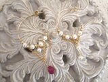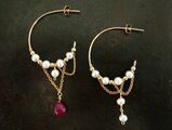 片方にだけピンクのルビーをぶら下げたアシンメトリーなフープピアスです。淡水パールとチェーンでデコラティブなイメージに仕上げました。(ベルサイユ風と言いましょうか…)