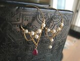 横から見ると、写真のように左右非対象にぶら下がるルビーやパールが綺麗に見えますが、真正面でもピアス穴の角度や顔の角度によって綺麗に見えると思います。
