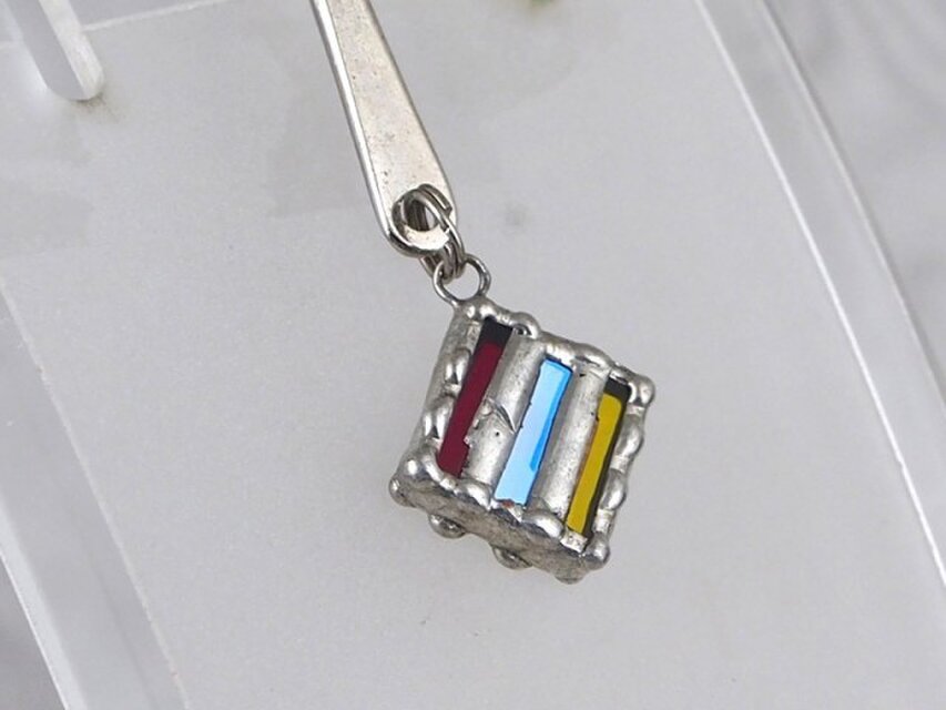 通常のステンドグラスではあり得ない細かさにカットした色ガラス3枚で正方形を作っています