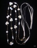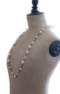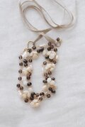 白いハンドカットのジェイドで作った小さなブーケ、クリーミーホワイトの穏やかな光を放つパール、パイライトとスモーキークオーツを集めた bitter & sweet の素材とグレージュのリボンをたっぷり使ったネックレス、Olga(オルガ)。優しさとすこしのほろ苦さ。クラシカルな留め具はアンティックテイスト。ジェイドは8mmから10mmの大きさ。ブーケの甘さに落ち着きを添えるパイライトはファセッテドラウンデルカットの⌀7mm。長さ89cm。リボンは付け外し可能で左右に30cm。リボンをサイドで結ぶなど、アレンジをお楽しみ下さい。しっとりとした落ち着きの、大人の女性のアクセサリー。