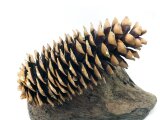 鱗片(りんぺん)が白っぽく、クリーム色に縁取られ、内側が赤みがかった褐色になっています。冬のインテリアにぴったりの雰囲気の大きな松ぼっくりです。