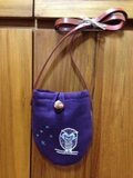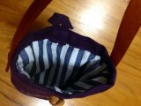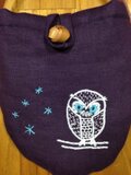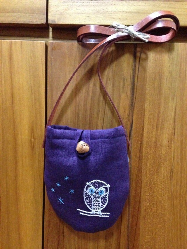 色は紫、裏布は縦縞です。表側にはフクロウ、裏側のポケットにも刺繍入り。