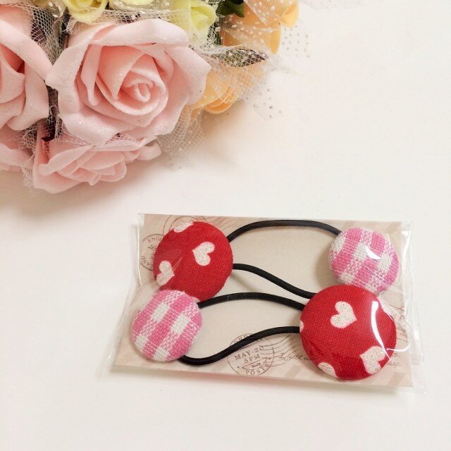 27mmと22mmのくるみボタンが、1つのヘアゴムについています。