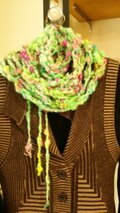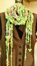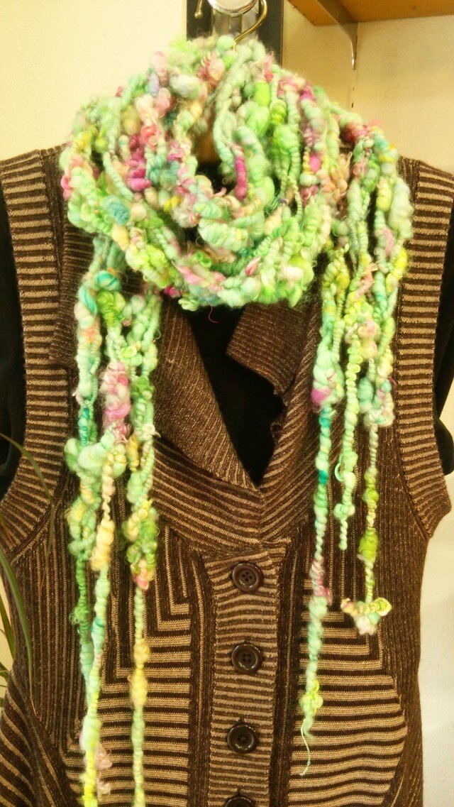 来ていただいてありがとうございます。アートのような可愛い糸で編んでいまし。見ているだけで楽しくなる色です。素材はウール100%です。巻き方は自由自在♪