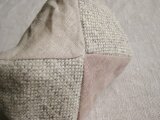 ベビーピンクとローズピンクのリネン生地と、白に近いグレーのウールをパッチワークし、