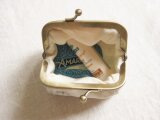 ブルーグレーの糸でちくちくした、お手玉型のぷっくりしたがま口ポーチです。