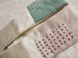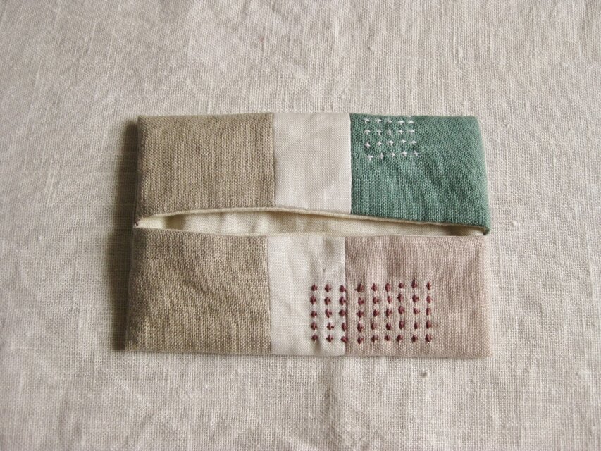 ナチュラルリネン、ベビーピンク、エメラルドグリーン生地をパッチワークし