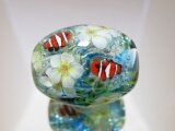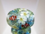 プルメリア・カクレクマノミは表面に描いたのではなく、ひとつずつパーツを作り、溶かしたガラスに埋め込みながら制作しております。