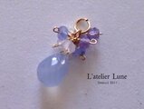 薄く不透明感のあるブルーカルセドニーのドロップをメイン石にしたチャームです。細かくカットされた非常に綺麗な石です。タンザナイト・アメジスト・ローズクォーツのボタンをあわせました。同色系でまとめたファンタジックなイメージ。黒い服などにあわせると映えますよ。