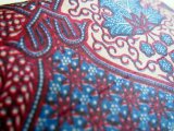 ブルー系の伝統柄のプリントで、華やかな雰囲気です。